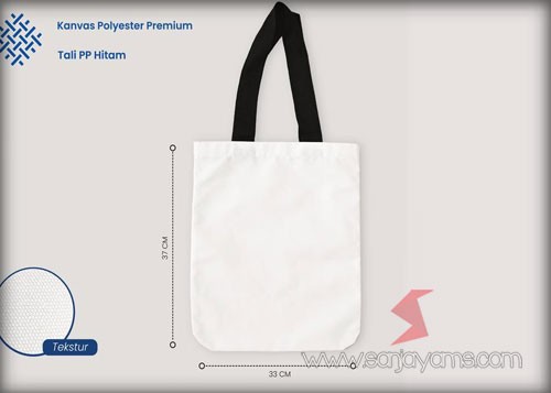 Material : Kanvas Polyester PremiumMaterial Tali : Tali PP HitamUkuran : 33 x 37 cmToleransi ukuran jahit ± 1 cm