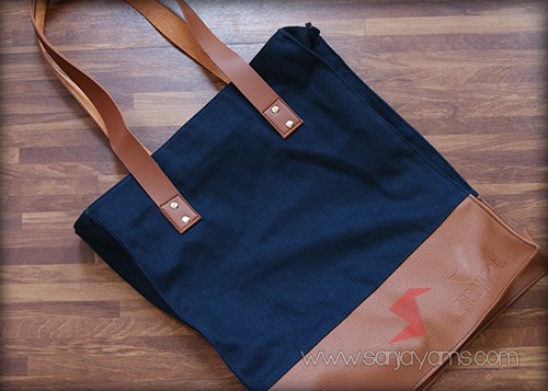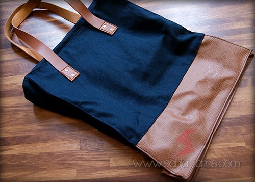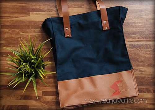 Goodie bag jeans kombinasi kulit dengan warna navy