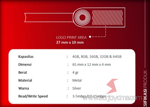 Spesifikasi: Material: Metal Warna: Silver Kapasitas: 4GB, 8GB, 16GB, 32GB, dan 64GB Read/Write Speed: 3-5mbps/10-15mbps