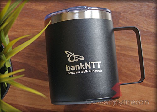 Mug Tumbler Stainless dilengkapi dengan tutup dan handle. Sangat tepat untuk souvenir ataupun media promosi perusahaan.