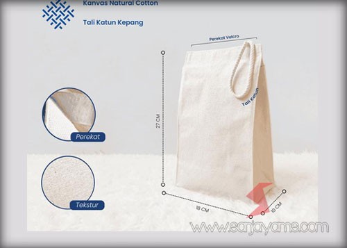 Material : Kanvas NaturalMaterial Tali : Tali KatunPenutup : Velcro Ukuran : 18 x 27 x 10 cm Toleransi ukuran jahit ± 1 cm