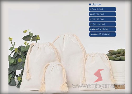 Material : BlacuMaterial Tali : Tali Katun Kepang Terdapat 6 ukuranUkuran 1 : 10 x 15 cmUkuran 2 : 15 x 20 cmUkuran 3 : 20 x 25 cmUkuran 4 : 25 x 30 cmUkuran 5 : 7 x 25 cmUkuran 6 : 13 x 30 cmToleransi ukuran jahit ± 1 cm