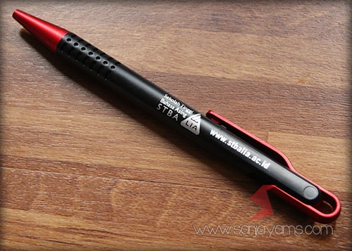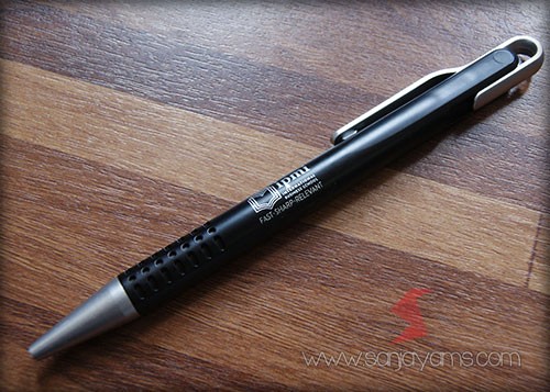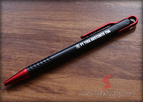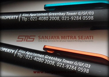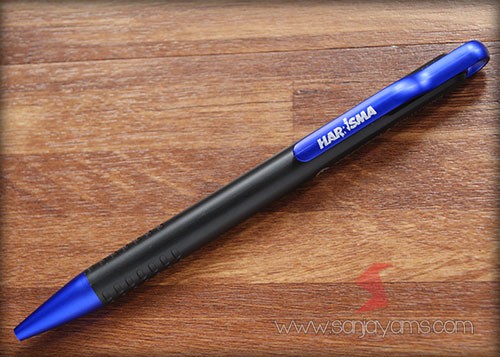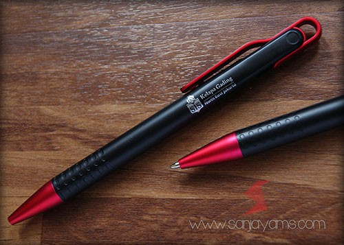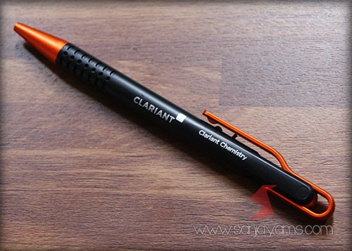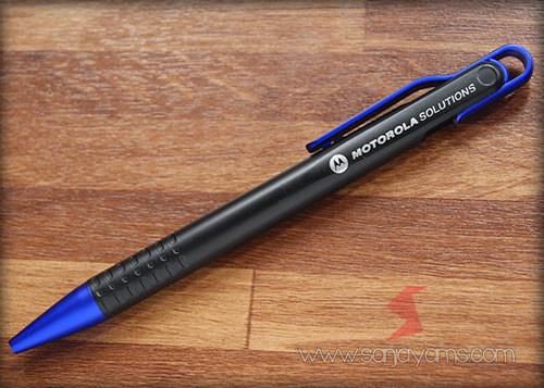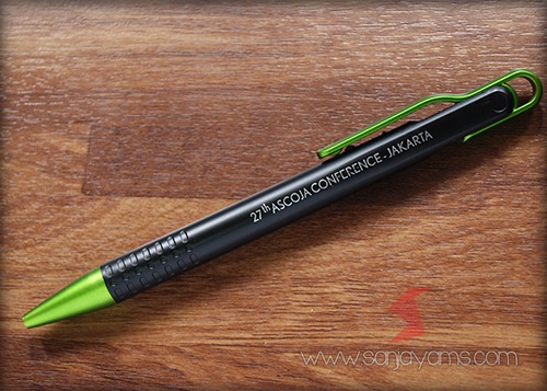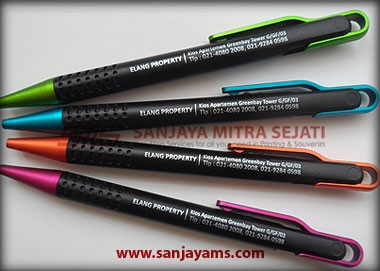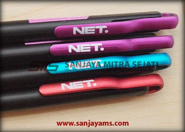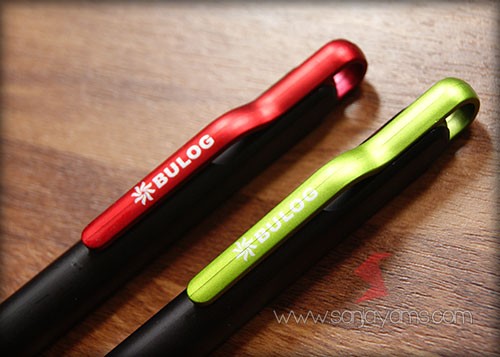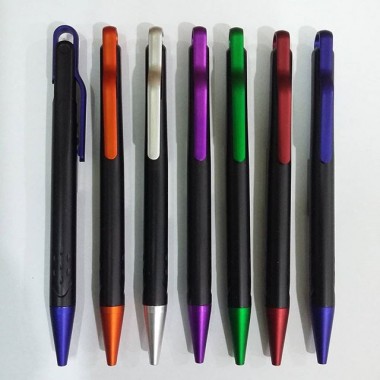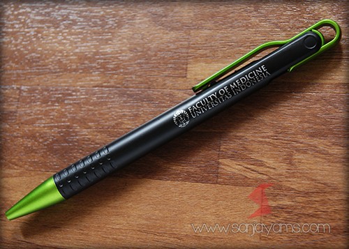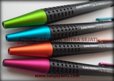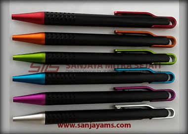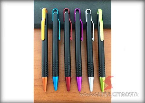 Pulpen promosi yang paling banyak disukai, dengan tampilan dasar pulpen berwarna hitam doff serta gagang dan ujung pulpen berwarna neon.